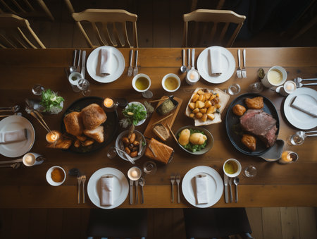 A beautifully set table showcasing a traditional roast dinner with Yorkshire pudding, captured from above in warm, rustic surroundings with visible steam. AI-generated
