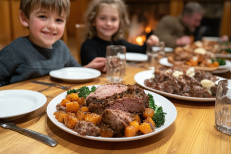 A warm family gathering bursts with laughter as generations connect over friendly games and a hearty meal Golden hues highlight roast beef, vegetables, and smiling children Soft light enhances the cozy atmosphere where memories are made around the table, celebrating togetherness and connection AI Generative