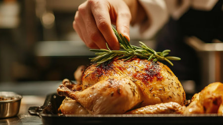 A chefs hand placing rosemary sprigs on a whole roasted chicken just before serving, with other garnishes ready on the side.