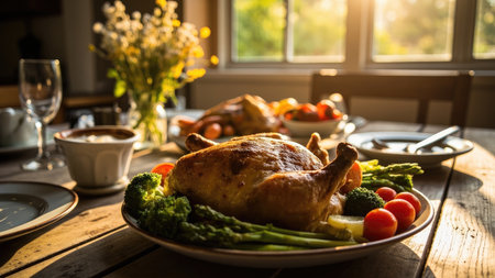 A roasted chicken with vegetables on a plate, sunlight on a wooden table, other dishes and flowers in the background.
