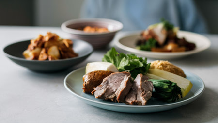 Elegant duck dinner in dim lighting. Perfectly cooked duck breast on a porcelain service, accentuated by gentle candlelight.
