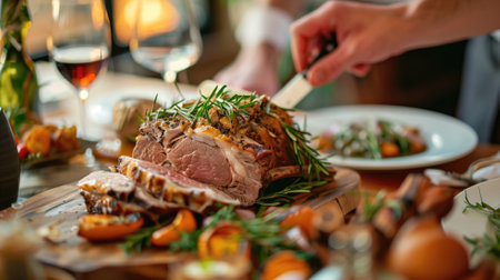 Hand carving a juicy roast dinner, garnished with fresh herbs