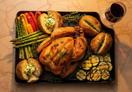 Roasted whole chicken served with baked potatoes and grilled vegetables like asparagus, bell peppers and zucchini