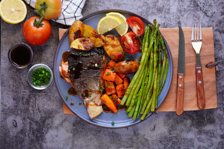 Homemade Grilled Salmon Steak with Broccoli, Potatoes, Carrots .In a plate on a wooden table