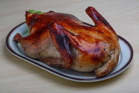 Beautiful food: baked whole duck close-up on a platter on the table. Horizontal view from above