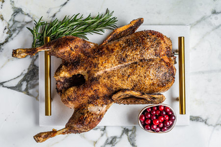 Homemade baked duck with oranges, berries and herbs. Crispy whole roast duck. Thanksgiving or Christmas dinner. place for text, top view.