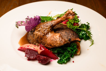 Close-up of roasted duck leg garnished with apples and herbs on plate