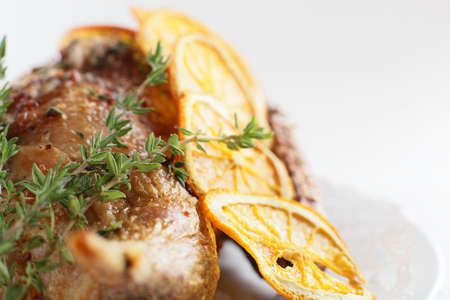 Roasted duck with vegetables, herbs, orange and apples. Food delicacy. Concept for food. Closeup