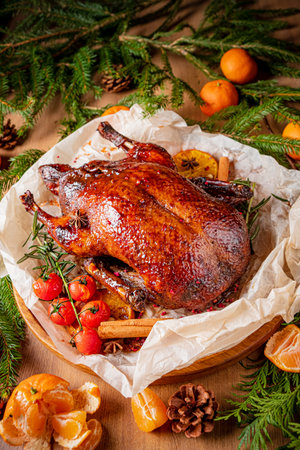 Roasted Christmas duck with green tree branch on wooden rustic table