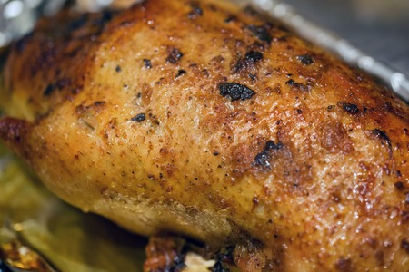 Appetizing chicken baked with apples. Zaporozhye region, Ukraine. December 2011