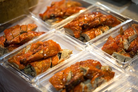 Chinese traditional local food store at Hong Kong, China. Roasted duck and pork meat. BBQ restaurant asia