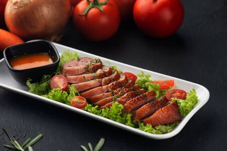 Peking duck slices with dipping sauce, fresh vegetables, and salad. Chinese cuisine. Top view. Close-up.
