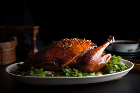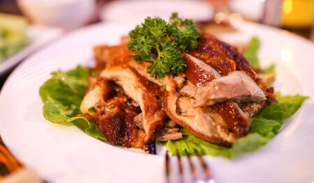Peking duck in a plate on the table. Exotic dish.