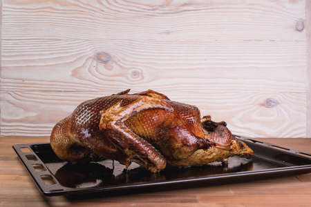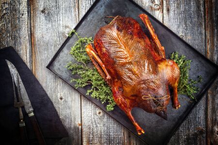 Beautiful food: baked whole duck close-up on a platter on the table. Horizontal view from above