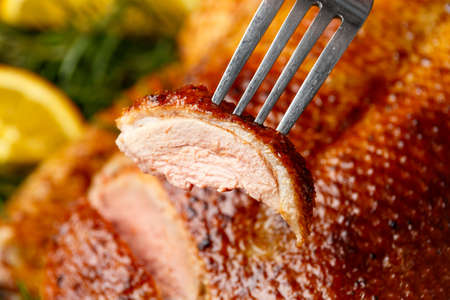 Slice of roasted Christmas duck, close up
