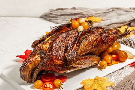 Whole roast duck stuffed with apples. Poultry served with pickled vegetables and sauce. A festive dish for Thanksgiving. Trendy hard light, dark shadow, white putty background, copy space