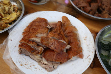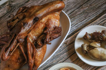 Delicious golden brown duck or steamed duck in Paloe or Lou mei Sauce (Thai name is Pedpalow) for Offering Sacrifices On Chinese New Year.