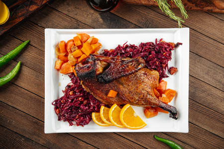 Baked whole duck, served with apples, red cabbage, oranges and roasted fritters. Natural wooden table in the background. Top view.