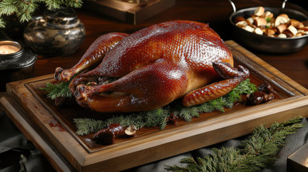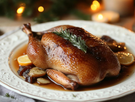 Delight in a beautifully roasted duck, garnished with fresh herbs, perfect for festive gatherings and special occasions. An exquisite culinary centerpiece.