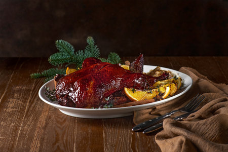 Roasted Christmas duck with green tree branch on wooden rustic table
