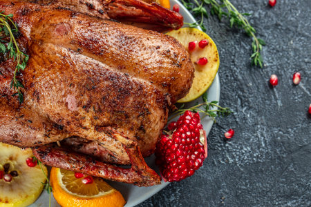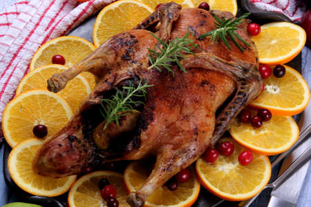 Homemade baked duck with oranges, berries and herbs. Crispy whole roast duck. Thanksgiving or Christmas dinner. place for text, top view.