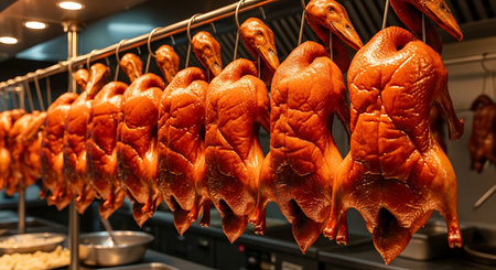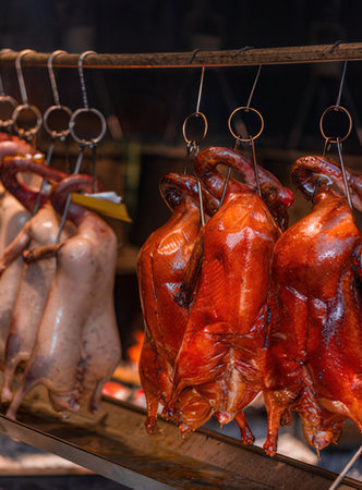 Roasted ducks and ribs hanging on rack showcase in restaurant's kitchen, concept of national food