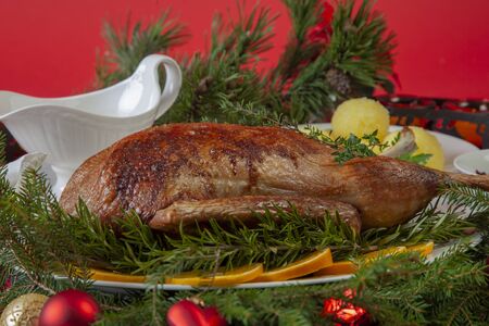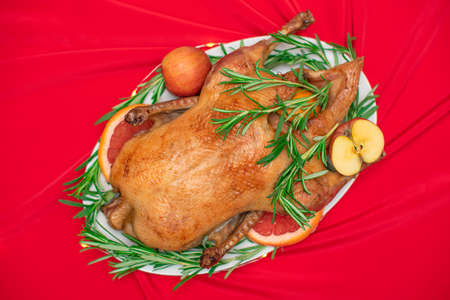 Christmas or Thanksgiving duck baked for traditional festive dinner with apples, rosemary, grapefruits on red Xmas table