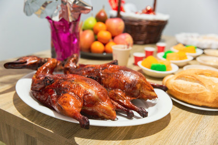 Glazed Peking Ducks Taking Center Stage on a Festive Vietnamese Table Spread
