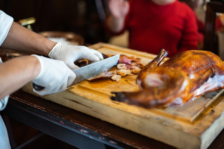 Kids are watching the chef is cutting the duck skin from the Beijing duck with a very sharp knife in a famous Chinese restaurant at the Chinese new year season.