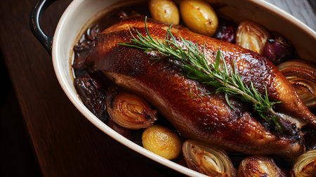 roasted duck with onion and rosemary in a casserole dish