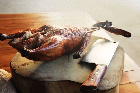 roasted duck with Chinese knife placed on old wooden chopping block