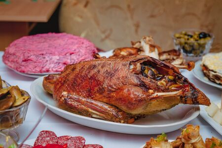 Festive home table, snacks, duck, stuffed pike fish