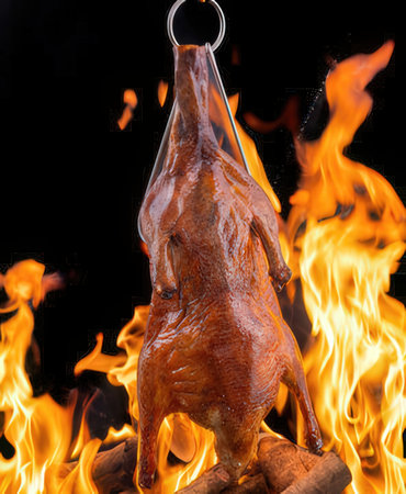 Whole roast duck on a spit with flames on a black background