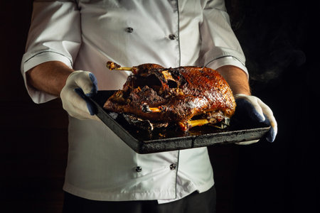 A chef holds a beautifully roasted duck on a black tray, showing the crispy skin and tender meat. The dark kitchen background enhances the dish's allure, inviting everyone to savor it.