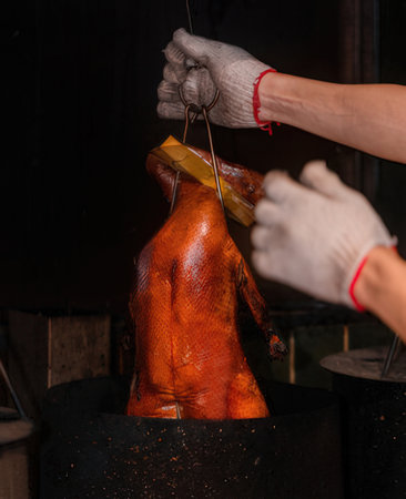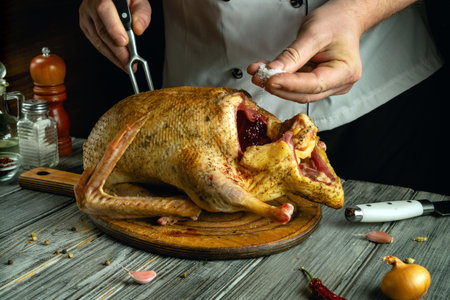 cooking a delicious roast duck with spices in restaurant