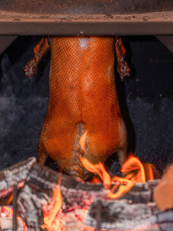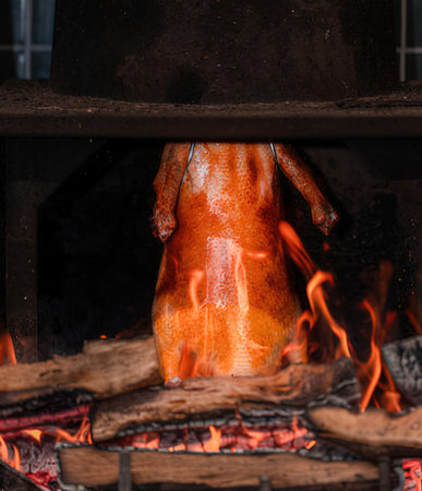 Roast duck on the fire in the fireplace in the restaurant.