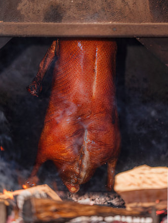 Roast duck on the spit in the smoke. Close-up.