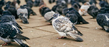 Banner shot of a lot of street pigeon standing on pavement on cold weather.