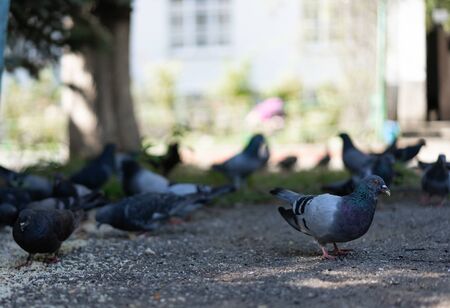 Pigeons in a city. concept of dirty hungry birds in the town.