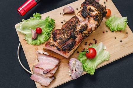 Set of wine, pork belly, vegetables, spices. On wooden board - baked sliced pork belly, served with vegetables and spices. Black background. Set of products for dinner. Restaurant menu.