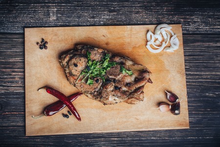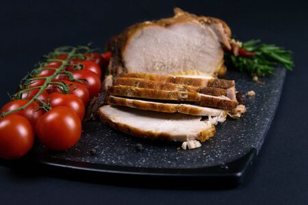 Roasted pork neck with spices on cutting board. Black background. Top view.