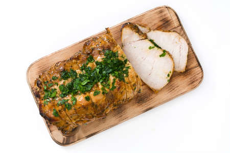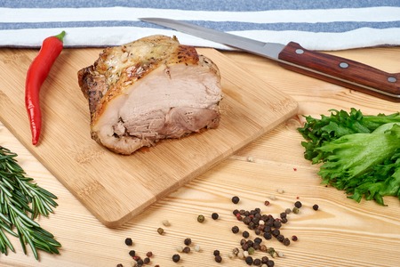 Baked boiled pork.Baked meat slice with garlic and spices on a wooden board.