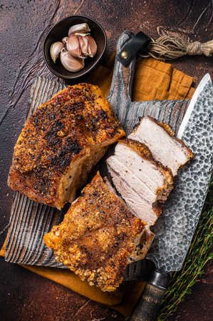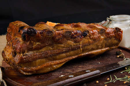 Roasted Pork belly bacon with crust on a wooden board. dark background. top view.