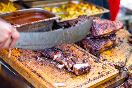 Close up of delicious roasted meat in a restaurant. Selective focus.