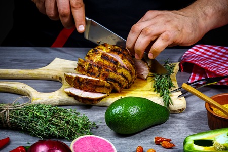 The chef prepares delicious roasted meat. Closeup of a fresh roasted meat