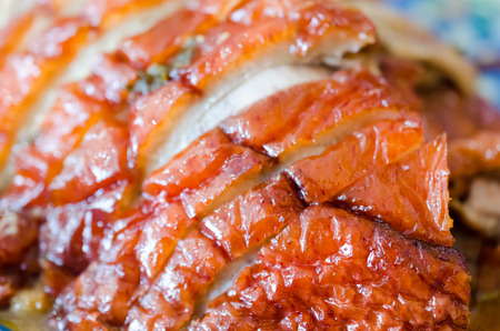 Chinese traditional local food store at Hong Kong, China. Roasted duck and pork meat. BBQ restaurant asia