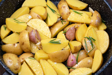 Potato wedges with rosemary, garlic and sea salt in iron cast skillet, closeup view