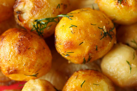 Baked young potatoes with rosemary. Whole baked potatoes as nice food background.