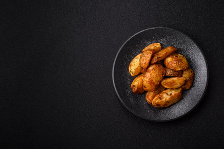 Healthy food concept. Backed young potatoes with spices and seasonings in black bowl