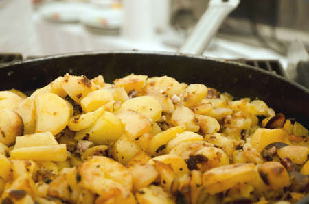 Fried potatoes in big pan, street food
